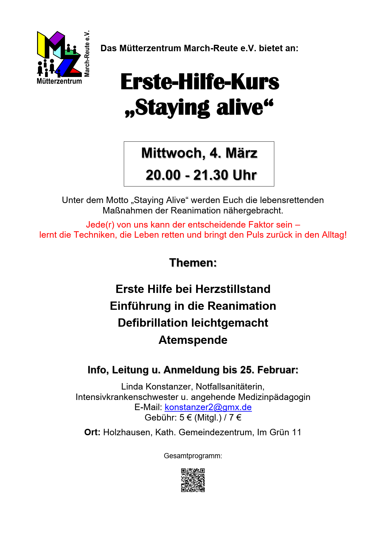 Leitung u. Anmeldung bis 25. Feb. bei: Linda Konstanzer, Notfallsanitäter, Intensivkrankenschwester und angehende Medizinpädagogin