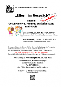 Info, Leitung und Anmeldung bis 16. Jan. / 22. Jan. bei Franziska Bürker, Kindheitspädagogin und psychologische Beraterin, Tel. 0173 3411944 oder E-Mail: franziska.buerker@icloud.com