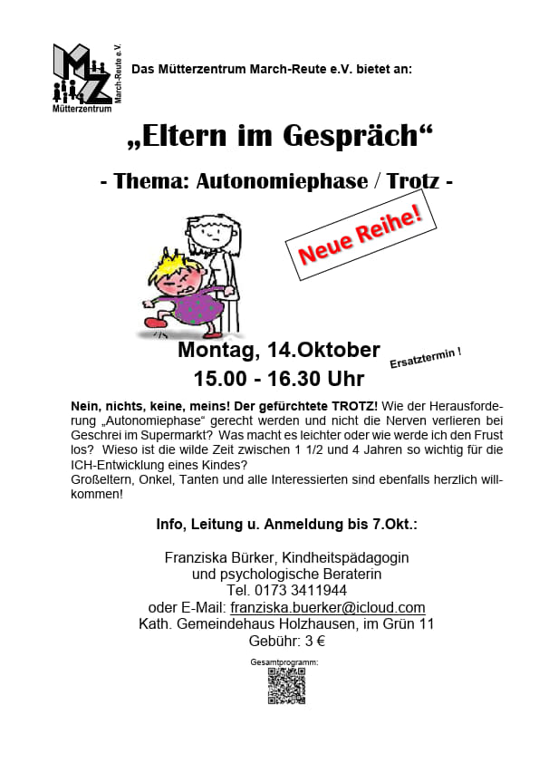 Info, Leitung und Anmeldung bis 07. Okt. bei Franziska Bürker, Kindheitspädagogin und psychologische Beraterin, Tel. 0173 3411944 oder E-Mail: franziska.buerker@icloud.com